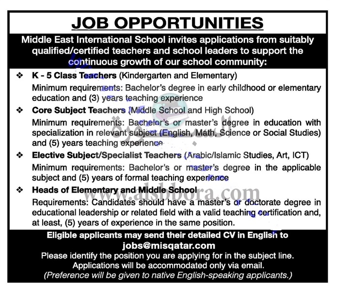 تعلن احدى المدارس الكبرى بدولة قطر عن حاجتها الى معلمين فى تخصصات اللغة الانجليزية والدراسات الاجتماعية والعلوم والانشطة، وعلى الراغبين فى التقدم ارسال السيرة الذاتية عبر الايميل المنشور فى الاعلان التالى: