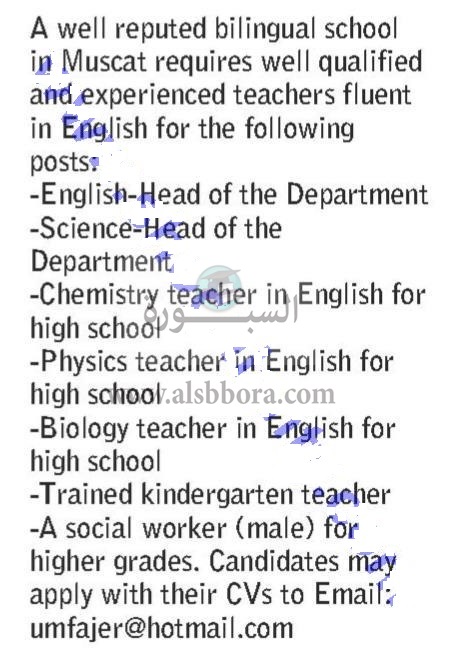 تعلن احدى المدارس الكبرى بسلكنة عمان عن حاجتها الى معلمين فى تخصصات اللغة الانجليزية والدراسات الاجتماعية والعلوم والانشطة والكيمياء والبيولوجى، وعلى الراغبين فى التقدم ارسال السيرة الذاتية عبر الايميل المنشور فى الاعلان التالى: