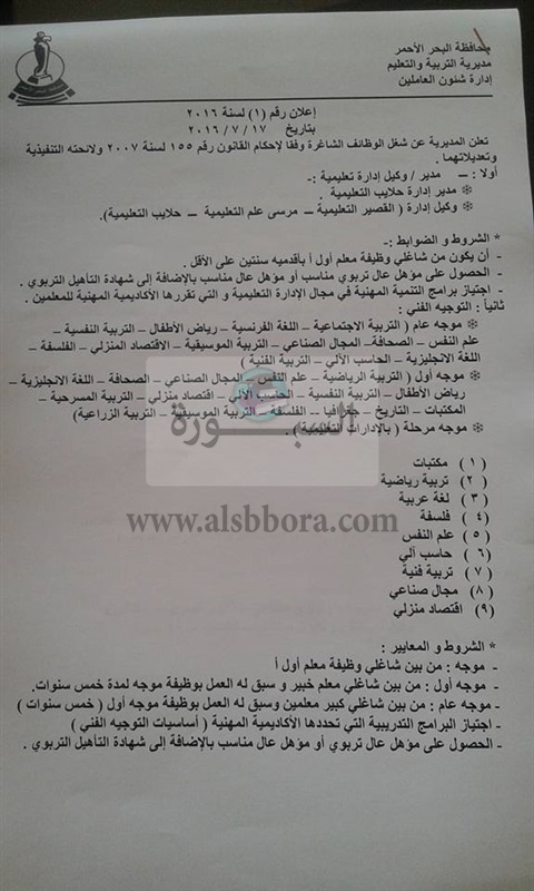 تعلن مديرية التربية والتعليم بمحافظة البحر الاحمر عن حاجتها الى العديد من الوظائف القيادية مدير ووكيل ادارة وموجه عام وموجه أول وموجه مرحلة بالادارات التعليمية، ولمزيد من التفاصيل عبر الاعلان التالى: