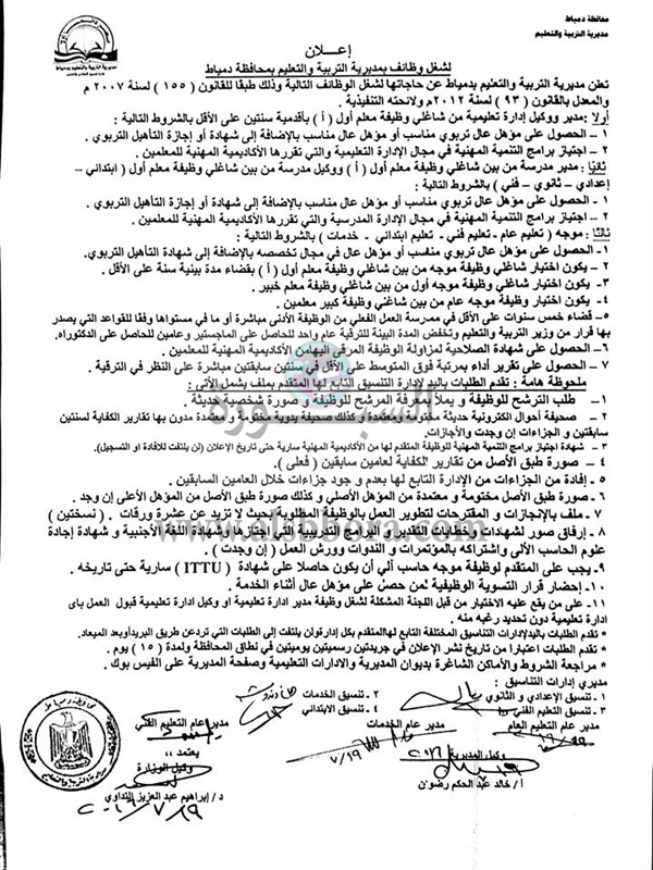ننشر شروط شغل وظائف مديرية التربية والتعليم بدمياط
