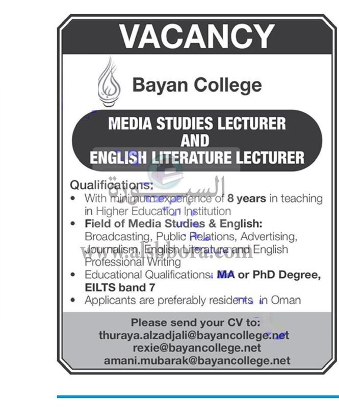 تعلن جامعة البيان في سلطنة عمان عن حاجتها للتعاقد مع أعضاء هيئة التدريس وذلك في التخصصات التالية: