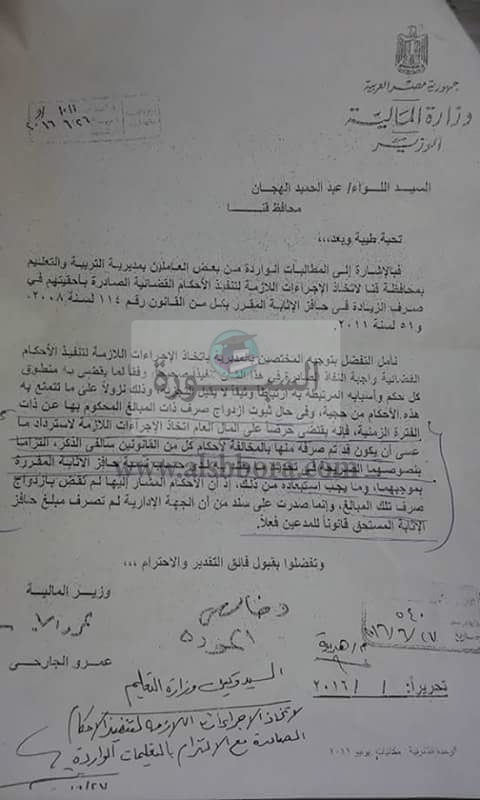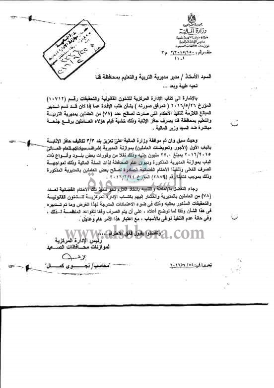 وأضاف الجعفري أن فتاوي صدرت من اعلي محكمة في مصر باحقيتنا و بطلان كلام المالية و الغريب التحدث بجبروت و بطرق تفهم منها انه لو تم الصرف سوف يفضح سر كبير وبعد رفع اكثر من جنحة و بعد مرار و خصومات لا يستطيع المعلم ان يتحملها ولا يوجد حصر لها وخصومات غير قانونية و ضياع رواتب الموظفين بالتربية والتعليم بقنا والجميع بالمالية يعتمدون على حماية غير عادية من وزارة المالية التي لم تحترم القضاء ولم تحترم المعلمين و العاملين بالتعليم.