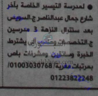 تعلن مدارس تيسير الخاصة بمنطقة المرج بمحافظة القاهرة عن حاجتها الى معلمين، وعلى الراغبين فى التقدم ارسال السيرة الذاتية على الايميل المنشور فى اعلان جريدة الاهرام بتاريخ اليوم الجمعة الموافق 2016/722.
