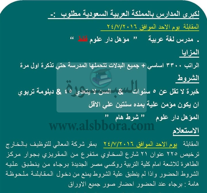 تعلن احدى المدارس الكبرى بالمملكة العربية السعودية عن حاجتها الى معلمين، وعلى الراغبين فى التقدم ارسال السيرة الذاتية عبر الايميل التالى: [email protected]، علما بان المقابلات غدا الأحد الموافق 2016/7/24