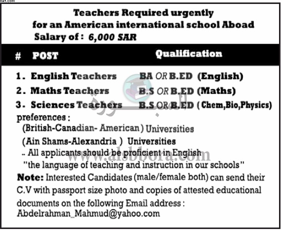 تعلن احدى المدارس الخاصة بالمملكة العربية السعودية عن حاجتها الى معلمين، وعلى الراغبين فى التقدم ارسال السيرة الذاتية على الايميل المنشور فى الاعلان التالى: