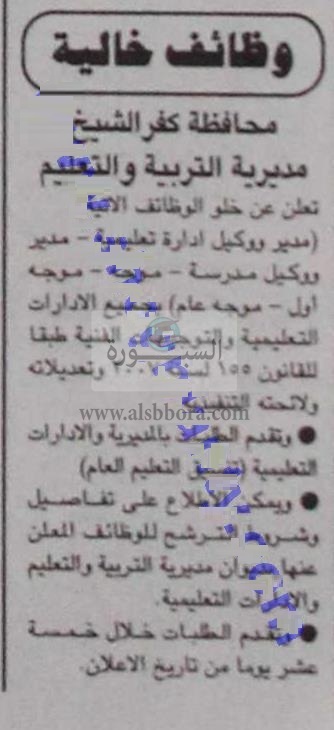 تعلن مديرية التربية والتعليم بمحافظة كفر الشيخ عن وظائف شاغرة للمعلمينوذلك وفقا لنص الإعلان التالي: