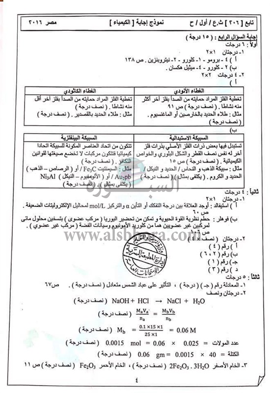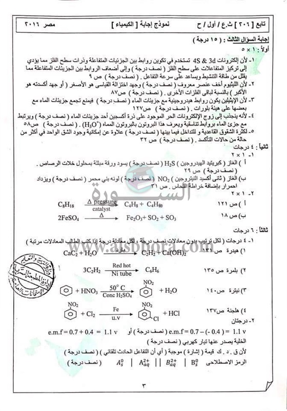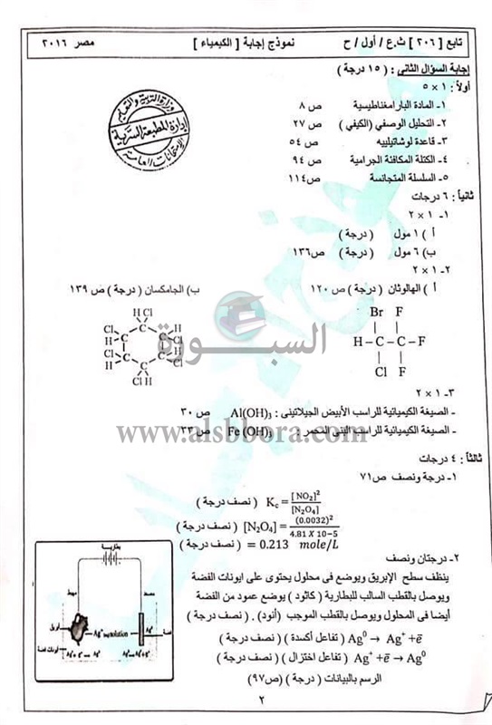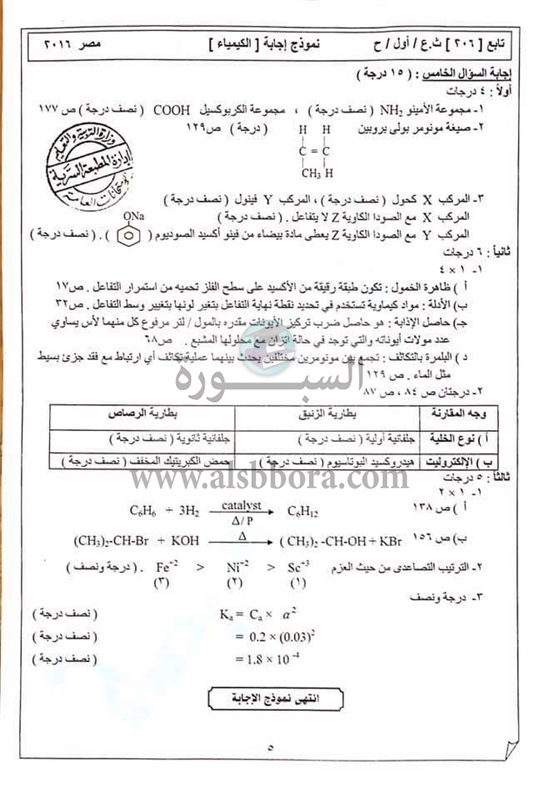 ننشر نموذج الاجابة لمادة الكيمياء للثانوية العامة ودرجات كل سؤال حسب ما ورد من وزارة التربية والتعليم