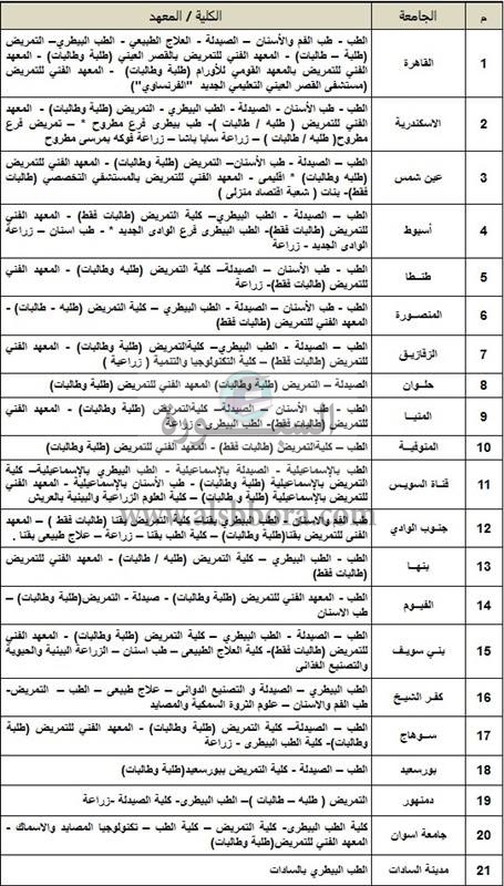 ينشر موقع السبورة قائمة باسماء الكليات المتاحة لطلاب المرحلة الأولى بالتننسيق والناجحين فى الثانوية العامة هذا العام.