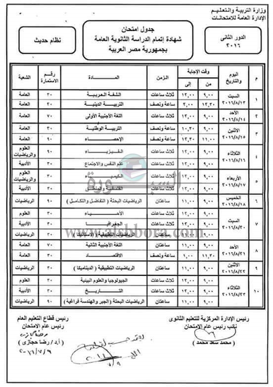 الثانوية العامة الدور الثانى (نظام حديث) للعام الدراسى 2015/2016، في الفترة من