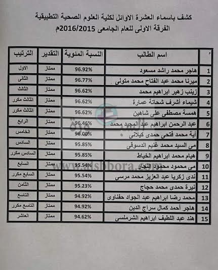 اعتمد الدكتور معوض الخولي، رئيس جامعة المنوفية، نتيجة الفرقة الأولى بكلية العلوم الصحية التطبيقة بنسبة نجاح 80% حيث تقدم للامتحان 220 طالب وطالبة، وجاء ترتيب الطلبة الأوائل بالكلية وبتقدير عام ممتاز كالتالي: هاجر محمد رشاد مسعود، ميرنا عبد الفتاح متولي، زينب زهير محمد، شيماء أشرف عمارة، همسة مصطفى شاهين، عبد الرحمن ابراهيم محمد، أية محمد كيلاني، مي السيد الدسوقي، هيام محمد الخياط، مي محمود الخياط، ندى زكريا مرسي، نيرة حمدي حجاج، محمد رضا الحفناوي، هاجر أحمد سراج الدين، هند عبد اللطيف ابراهيم.