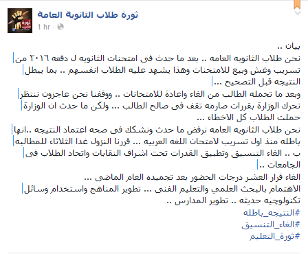 وجاء البيان كالتالى: "نحن طلاب الثانوية العامة، بعد ما حدث في امتحانات الثانوية لدفعة ٢٠١٦ من تسريب وغش وبيع للامتحانات وهذا يشهد عليه الطلاب أنفسهم، بما يبطل النتيجة قبل التصحيح، وبعد ما تحمله الطالب من إلغاء واعادة للامتحانات، ووقفنا نحن عاجزين ننتظر تحرك الوزارة بقررات صارمة تقف في صالح الطالب، ولكن ما حدث أن الوزارة حملت الطلاب كل الأخطاء".