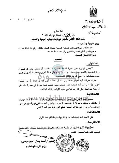 ينشر موقع السبورة القرار الوزارى رقم 449 الذى اصدره الدكتور الهلالى الشربينى، وزير التربية والتعليم والتعليم الفنى، بشأن الحد الأدنى للأجور فى ديوان وزارة التربية والتعليم.