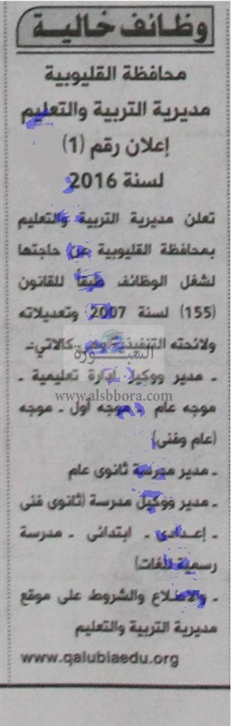 تعلن وزارة التربية والتعليم عن حاجتها الى وظائف قيادية لمديرية التربية والتعليم بمحافظة القليوبية (مدير ووكيل ادارة تعليمية، موجه عام، موجه أول، موجه عام وفنى، مدير مدرسة ثانوى عام، مدير ووكيل مدرسة ثانوى فنى، اعدادى، ابتدائى، مدرسة رسمية للغات)، وعلى الراغبين فى التقدم ولمزيد من التفاصيل عبر الاعلان المنشور فى جريدة الجمهورية بتاريخ اليوم الموافق 2016/7/27.