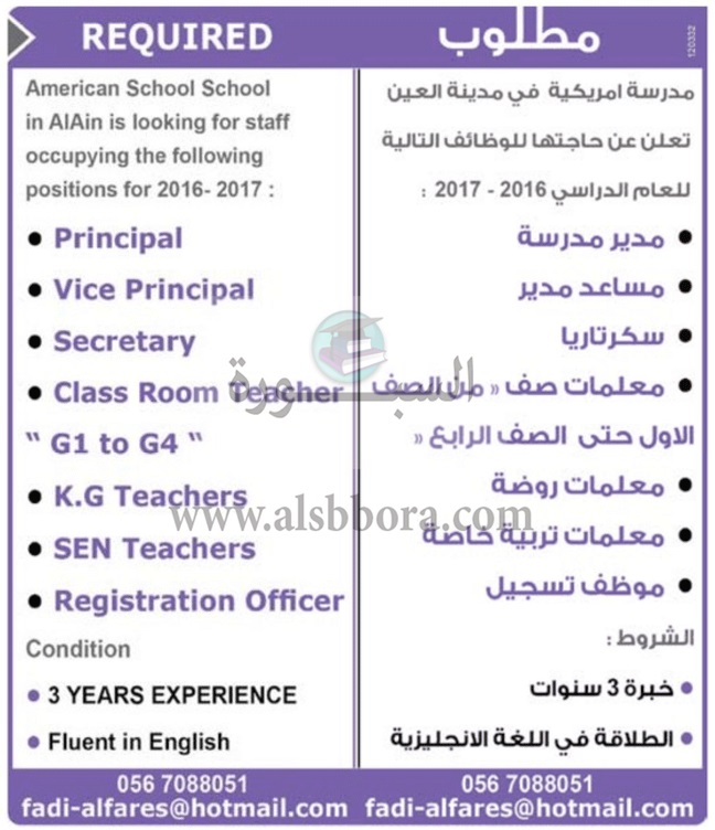 تعلن احدى المدارس الامريكية بمدينة العين بالامارات العربية المتحدة عن حاجتها الى معلمين ومعلمات، وعلى الراغبين فى التقدم ارسال السيرة الذاتية عبر الايميل المنشور فى الاعلان التالى:
