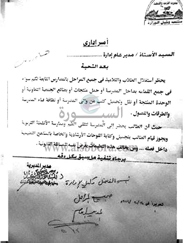ينشر موقع السبورة أمرا إداريا، بعدم تكليف الطالب بأى عمل داخل المدرسة مثل: جمع القمامة، أو نقل الكتب، أو حمل بضائع الجمعية التعاونية، أو نظافة فناء المدرسة، أو الفصل، ومن يفعل ذلك يعرض نفسه للمسائلة القانونية.