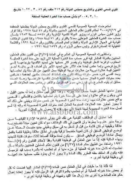 ينشر موقع السبورة فتوي قسمي الفتوي والتشريع بمجلس الدولة رقم 212 ملف رقم 86 - 3 - 1022 بتاريخ 10 -3 -2005م بشأن حساب مدة الخبرة العملية السابقة.