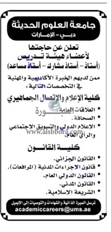 تعلن جامعة العلوم الحديثة الامارتية عن وظائف شاغرة لأعضاء هيئة التدريس" من معيد الي أستاذ" وذلك وفقا لنص الإعلان التالي: