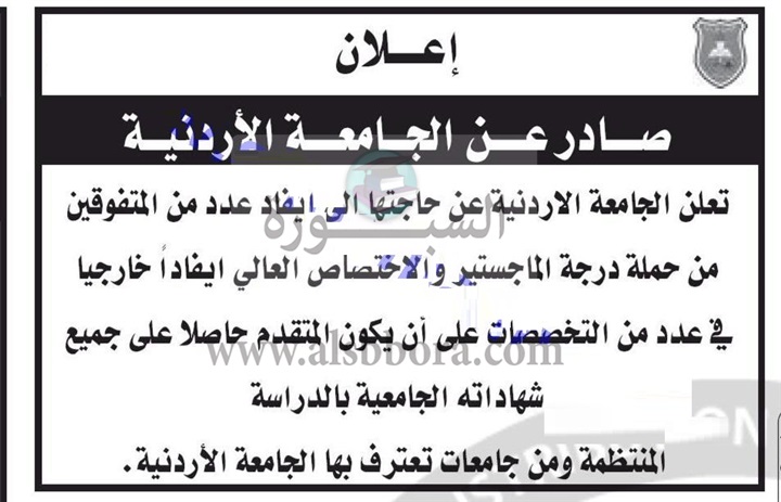 تعلن الجامعة الأردنية عن وظائف شاغرة لأعضاء هيئة التدريس" من معيد الي أستاذ" وذلك وفقا لنص الإعلان التالي: