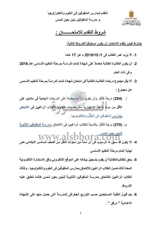 ينشر موقع السبورة شروط التقدم لمدارس المتفوقين الثانوية، ومدارس المتفوقين فى العلوم والتكنولوجيا .