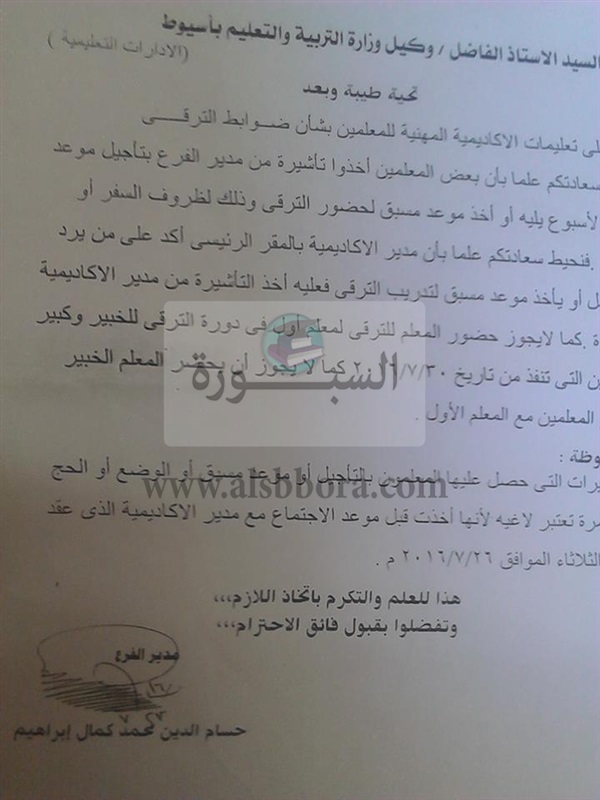 ننشر الفاكس الخاص بشأن تأجيل مواعيد تدريب المعلمين المرشحين للترقى والضوابط المطلوبة