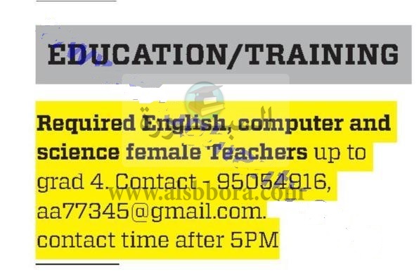 تعلن احدى المدارس الكبرى بسلطنة عمان عن حاجتها الى معلمين، وعلى الراغبين فى التقدم ارسال السيرة الذاتية على الايميل المنشور فى الاعلان التالى: