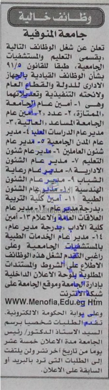 تعلن جامعة المنوفية عن حاجتها للتعاقد مع موظفين وذلك في وظائف شاغرة في التخصصات التالية: