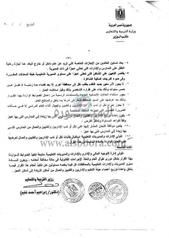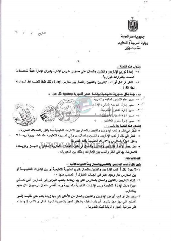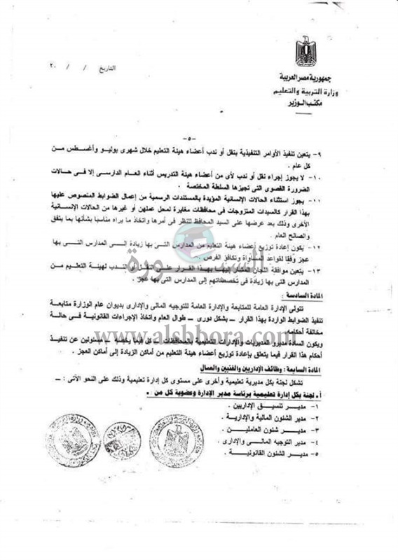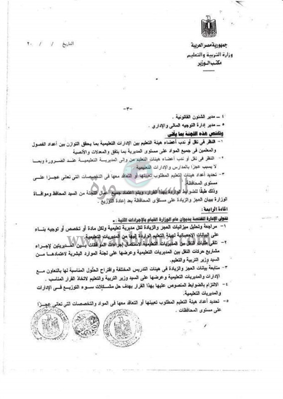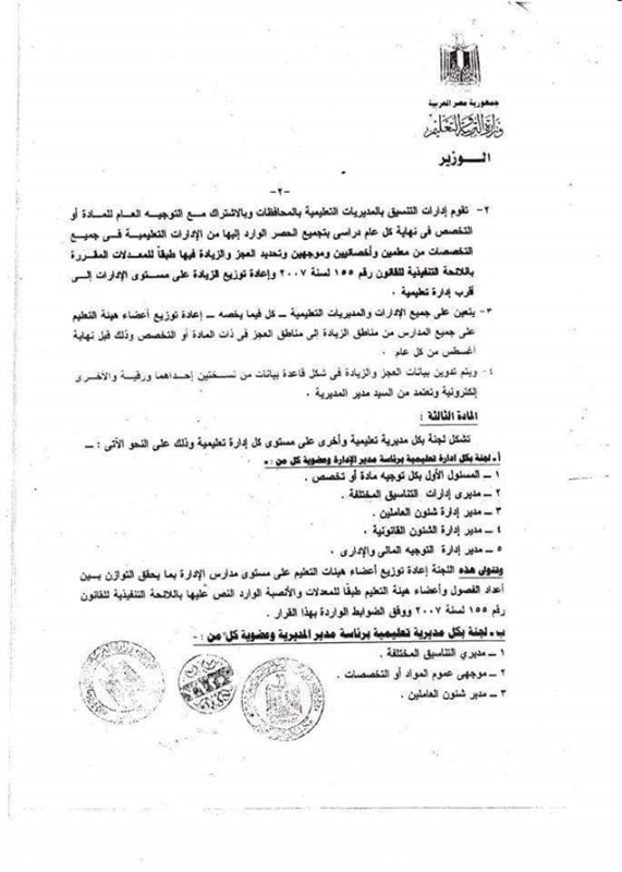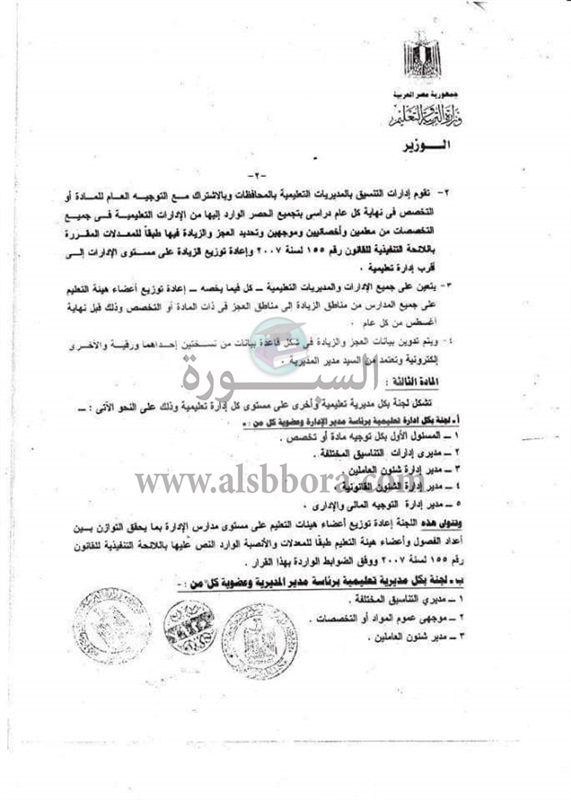 بالمستندات| ننشر قرار توزيع المعلمين والإداريين والخدمات المعاونة بالمدارس و المديريات التعليمية