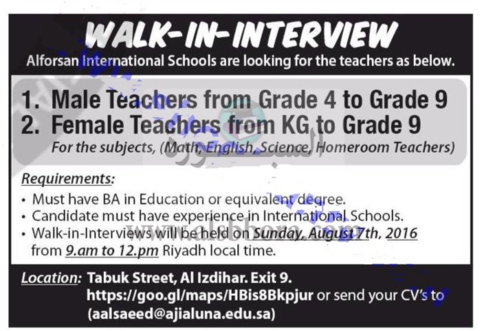تعلن كبرى المدارس بالمملكة العربية السعودية عن حاجتها الى معلمين فى تخصصات الانجليزى والرياضيات والعلوم، وعلى الراغبين فى التقدم من خلال الايميل المنشور فى الاعلان التالى: