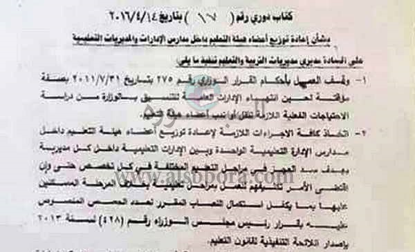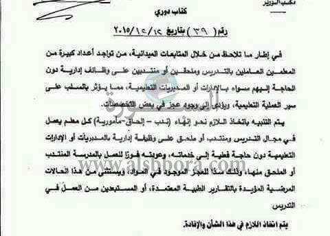 يجب الالتزام بالكتاب الدوري الخاص باعادة توزيع المعلمين بكل محافظة وداخل الادارة الواحدة ثم بين الادارات المختلفة داخل المحافظة .