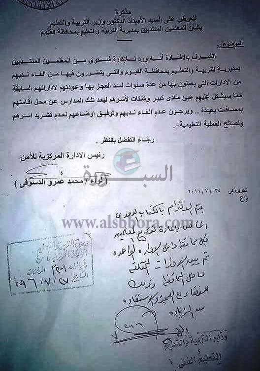 بعد الغاء الانتدابات بإدارة غرب الفيوم التعليمية وبعد تكييف ظروف المعلمين الذين كانوا منتدبين الى الادارة منذ اكثر من عشر سنوات واكثر او اقل