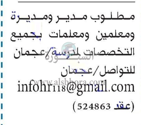 تعلن عدد من المدارس في عجمان بدولة الامارات العربية المتحدة عن جديدة للمعلمين في جميع المواد وذلك وفقا للإعلان التالي: