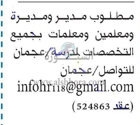تعلن مدرسة خاصة في الامارات عن وظائف شاغرة للمعلمين في جميع المواد وذلك وفقا لنص الاعلان التالي: