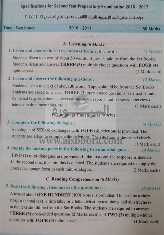 ينشر موقع السبورة نموذج مواصفات امتحان اللغة الإنجليزية للصف الثانى الإعدادى 2016/2017.