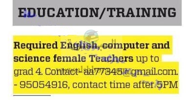 تعلن احدى المدارس الكبرى بسلطنة عمان عن حاجتها الى معلمين، وعلى الراغبين فى التقدم ارسال السيرة الذاتية على الايميل المنشور فى الاعلان التالى: