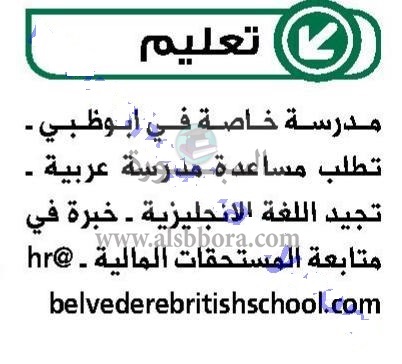 تعلن احدى المدارس الكبرى بدولة الامارات العربية المتحدة عن حاجتها الى معلمات، وعلى الراغبين فى التقدم ارسال السيرة الذاتية على الايميل المنشور عبر الاعلان التالى: