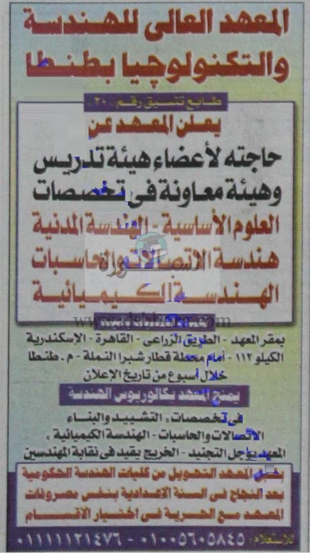 يعلن المعهد العالي للهندسة والتكنولوجيا بطنطا عن وظائف شاغرة لأعضاء هيئة التدريس وذلك وفقا للإعلان التالي: