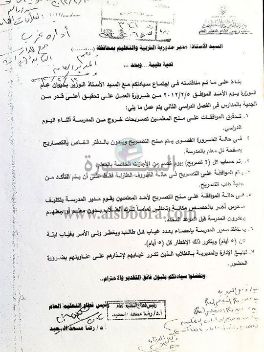 ننشر فاكس التعليم بشأن التصريح للمعلم بالخروج أثناء اليوم الدراسى