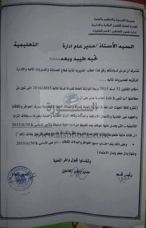 ننشر القرار الخاص بشأن صرف الحوافز والمكافآت وبدل المعلم والاعتماد على اساسى 2015/6/30