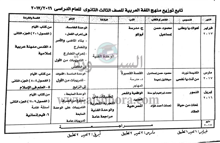 ينشر موقع السبورة توزيع منهج اللغة العربية للصف الثالث الثانوى العام للعام الدراسى 2017/2016، التيرم الأول والثانى.