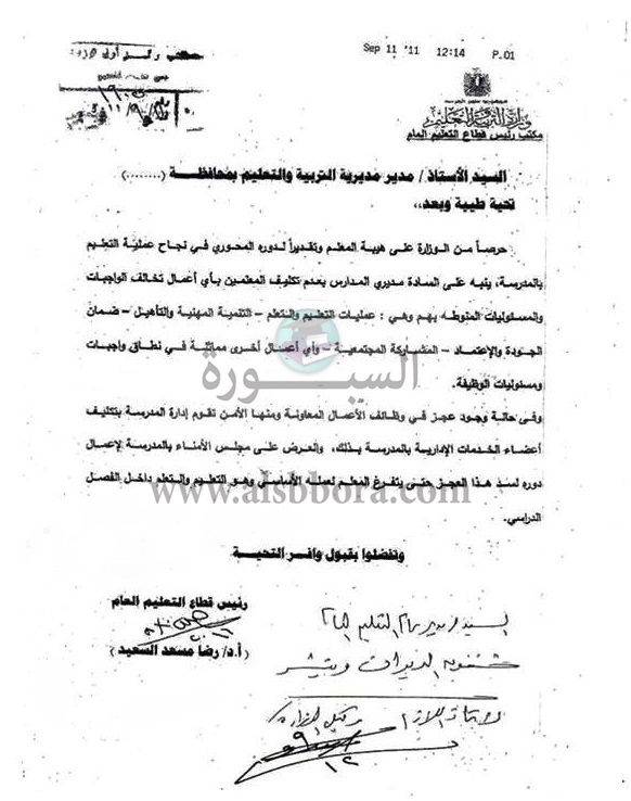 ينشر موقع السبورة قرارا بشأن عدم تكليف المعلم بأى أعمال تخالف الواجبات والمسئوليات المنوطة به وهى: عمليات التعليم والتعلم - التنمية المهنية والتأهيل - ضمان الجودة والاعتماد - المشاركة المجتمعية.