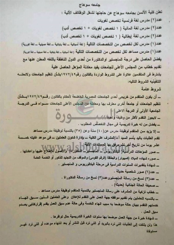 تعلن جامعة سوهاج عن حاجتها إلى أعضاء هية التدريس بكلية الألسن، وعلى الراغبين فى التقدم باليد باسم السيد أ.د/ المشرف علي الكلية، بإدارة شئون العاملين، في موعد غايته خمسه عشر يوماً من تاريخ نشر الاعلان .