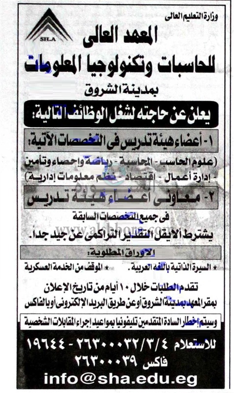 يعلن المعهد العالي بمدينة الشروق عن وظائف شاغرة لأعضاء هيئة التدريس" من معيد الي أستاذ" وذلك وفقا لنص الإعلان التالي: