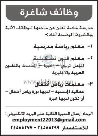 تعلن احدى المدارس الكبرى بسلطنة عمان عن حاجتها الى معلمين ومعلمات، وعلى الراغبين فى التقدم ولمزيد من التفاصيل عبر الاعلان التالى: