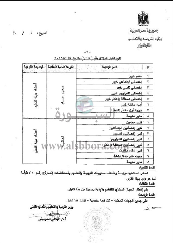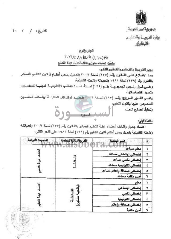 ينشر موقع السبورة القرار رقم 165 لسنة 2016 بشأن اعتماد جدول وظائف أعضاء هيئة التعليم.