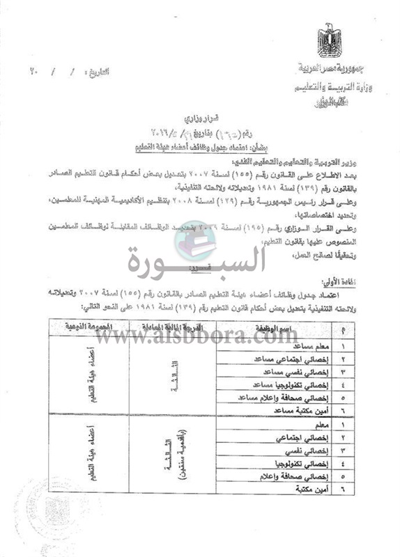 ينشر موقع السبورة قرار وزير التربية والتعليم رقم 165 لسنة 2011م والقانون رقم 155 لسنة 2007م وتعديلاته بشأن الدرجة المالية للمعلم المساعد وهى الدرجة الثالثة.