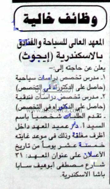 يعلن المعهد العالي للسياحة والفنادق بالإسكندرية عن وظائف شاغرة لأعضاء هيئة التدريس وذلك في التخصصات التالية: