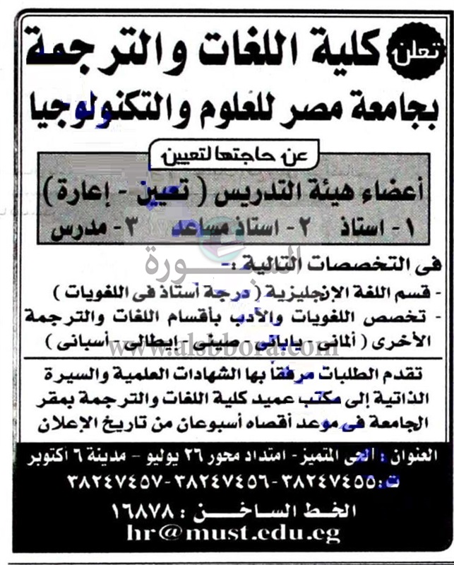 تعلن جامعة مصر للعلوم التكنولوجيا عن وظائف جديدة لأعضاء هيئة التدريس في عدد من التخصصات وذلك وفقا لنص الإعلان التالي: