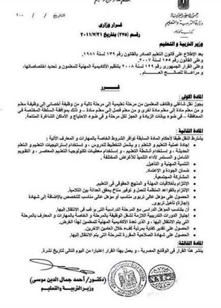 تنشر" السبورة" القرار 275 والخاص بتغيير المسمي الوظيفي من معلم ابتدائي الي اعدادي او ثانوي ومن معلم فصل او مكتبة الي معلم مادة