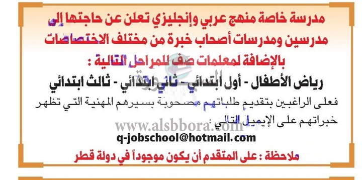 تعلن مدرسة خاصة في دولة قطر تعلن عن وظائف جديدة للمعلمين في جميع المواد وذلك وفقا لنص الاعلان التالي: