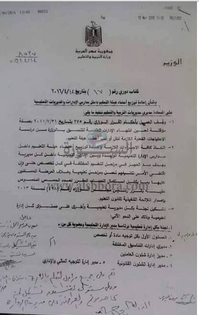 ننشر الكتاب الدورى الخاص باعادة توزيع المعلمين داخل المدارس والادارات والمديريات التعليمية